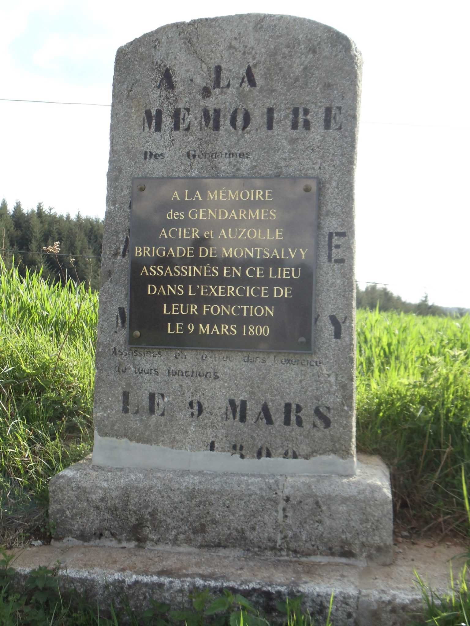 En revenant de Montsalvy, si nous prenons l’ancienne route nationale pour nous rendre à Polvrières, nous empruntons un petit chemin sur lequel se trouve à une centaine de mètre une stèle qui a été placée là en 1939 à la mémoire de deux gendarmes « ACIER et AUZOLLE » assassinés en ce lieu le 9 mars 1800.